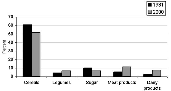 The changes in consumption patterns of Egyptian populations shown in the data from these two surveys can be explained by changes in socio-economic status, feeding habits, urbanization and globalization. The per capita consumption of cereals decreased from 1 980 kcal in 1981 to 1 266 kcal in 2000; cereals accounted for 61.2 percent of the total energy intake in 1981, and only 52 percent in 2000. Sugars share of total consumption also decreased, from 10.1 percent of total energy intake in 1981 to 7.7 percent in 2000. Over the same period, per capita consumption of items in the meat group increased from 163 kcal, representing 5.6 percent of total energy intake, to 298 kcal - 10.9 percent of total energy intake. The per capita consumption of items in the milk group increased from 74 kcal and 2.5 percent of total energy intake, to 177 kcal and 7.0 percent of total energy intake. This means that the percentage contribution of animal protein to total energy increased from 8.1 percent in 1981 to 19 percent in 2000 (Figure 6).