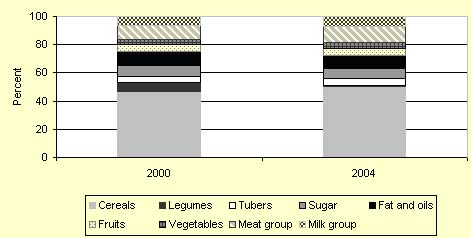 In order to compare the national dietary surveys conducted in 2000 and 2004, the dietary intakes of mothers were reanalysed to provide more comprehensive results. Table 1 and Figure 8 show the contributions of different food groups to the total energy intakes of mothers in 2000 and 2004. The total energy intake of mothers decreased from 2 602 kcal in 2000 to 1 995 kcal in 2004. The contribution of cereals to the total energy intake of mothers decreased from 1 349 to 1 066 kcal.