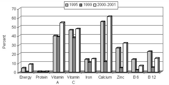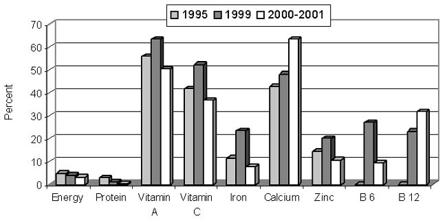 Data from ARC surveys conducted between 1995 and 2002 show the percentages of mothers and children aged two to five years who consumed less than 50 percent of the United States RDAs of selected macro- and micronutrients (Figures 9 and 10). The percentage of mothers with inadequate intakes of several nutrients decreased over time, but there are still notably high percentages of women with low intakes of vitamins A and C and calcium. The iron intake data shown here are not adjusted for bioavailability.