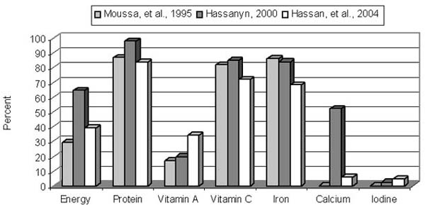 The results showed that fathers share was almost equal to that recommended; mothers was much higher than that recommended, especially in urban areas; and preschool and schoolchildren had lower than recommended energy intakes. Fathers consumed more than the recommended shares of iron, vitamin C and calcium, and the recommended share of vitamin A. All other target individuals except mothers consumed less than the recommended shares of calcium. These results were more pronounced in rural than urban communities. (Shaheen and Tawfik, 2000).