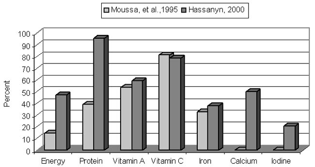 The FTRI/ARC surveys conducted since 1993 used a rotating sampling scheme. The first and largest round drew its sample from rural and urban areas in Cairo, Aswan, New Valley, Ismalia and Dakhalia governorates. Subsequent rounds utilized some overlapping and some different governorates, which were selected to include a large urban centre and governorates representing the Nile Delta and Upper Egypt. Data on adult women and on children aged two to six years were collected by the household food frequency method and quantitative 24-hour recall, with collection of detailed household recipes for prepared foods and the modelling survey methodology or that used in the United States National Nutrition Monitoring System surveys. Food intake data were converted to nutrient intakes using a modification of the United States Department of Agricultures (USDA) standard reference database (Food Intake and Analysis System, Version 2.3, University of Texas), which was adjusted to remove the influence of enrichment/fortification and to include more than 1 000 Egypt-specific recipes (Khorshed et al., 1998). Nutrient intake adequacy was expressed using the extant versions of the United States RDAs (published by the National Academy Press since 1989). The quality of the first round of these data was investigated with regard to completeness and underreporting (Harrison et al., 2000) and it was found that the degree of apparent underreporting was far lower than it was in surveys of adult American women conducted with a similar methodology.