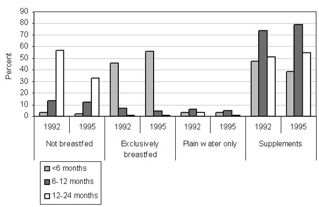 Infant feeding patterns have important impacts on the health of children. According to the Egypt Demographic and Health Surveys (EDHS) of 1992 and 1995, almost all Egyptian children (about 92 percent) are breastfed for some period, and there was no significant change in this figure between the two studies. Among the children who are breastfed, the percentage of those for whom breastfeeding begins within the first day after birth increased. Exclusive breastfeeding of children up to six months of age also increased between 1992 and 1995, as did the number of children over six months of age who received complementary foods (Figure 13). These positive trends imply that nutrition education programmes for mothers have been well received. The complementary foods that are given along with breastmilk to infants of six to 24 months usually include cereals, cows milk and products, eggs, meat, vegetables and fruits.