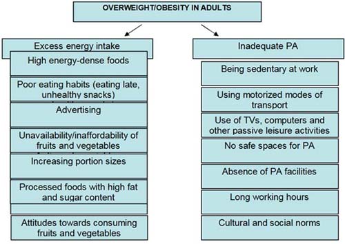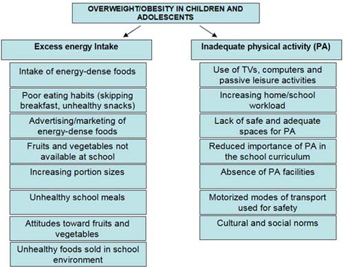 The diagrams that follow represent the four main nutritional problems identified during working group sessions: overweight/obesity in children and adolescents; undernutrition in children and adolescents; overweight and obesity in adults; and iron-deficiency anaemia (IDA) and other micronutrient deficiencies in children, adolescents and adults. For each problem, a series of determinants were identified and a list of potential solutions suggested. Solutions that are shaded in grey were considered particularly appropriate for addressing problems of under- and overnutrition for the age group identified.
