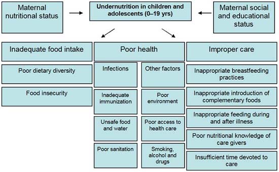 Workshop participants listed underlying causes of the major malnutrition problems identified in the case study countries: overweight and obesity in adults, adolescents and children; undernutrition (stunting, wasting and underweight) in children; and micronutrient deficiencies, particularly iron but also other micronutrients, which are widespread in some countries. For each broad underlying cause, a matrix of determinants was elaborated and solutions were proposed. As part of this process, the solutions that were considered beneficial for reducing both under- and overnutrition were highlighted.